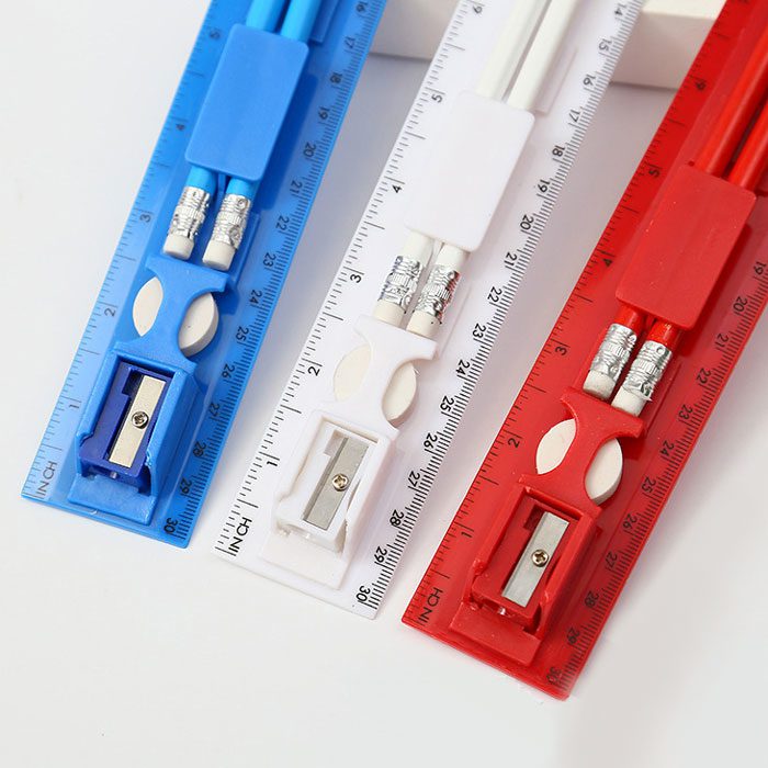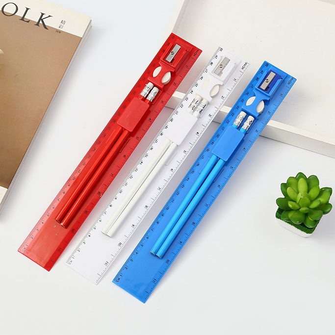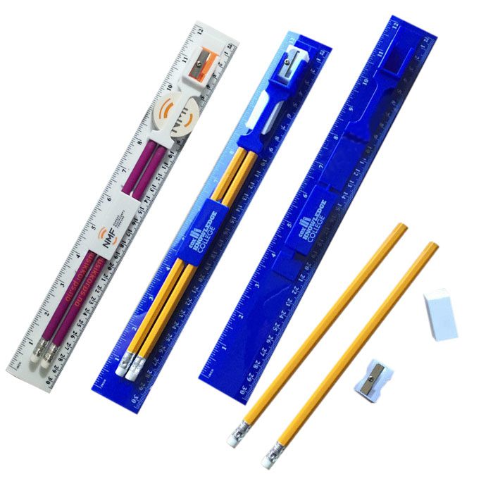 5合1文具禮品套裝包括了兩隻鉛筆、1塊擦紙膠,1個筆刨和1把直尺。印刷LOGO後,這套禮品文具套裝是典型的宣傳禮品。