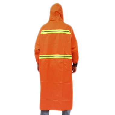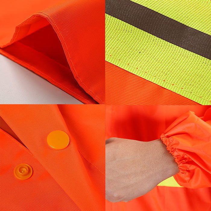 套頭反光工作雨衣:扣鈕式門襟,方便穿戴,雨衣主體車縫了夜間高亮反光條,可以訂製單條反光條或者雙反光條。