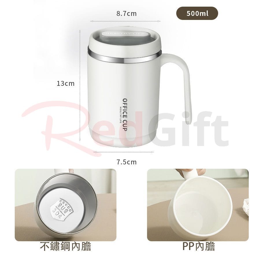 500ML帶手柄保溫杯:內膽有三種材質,分別是PP、304不鏽鋼、316不鏽鋼;即使預算有限,也能滿足不同訂製需要。