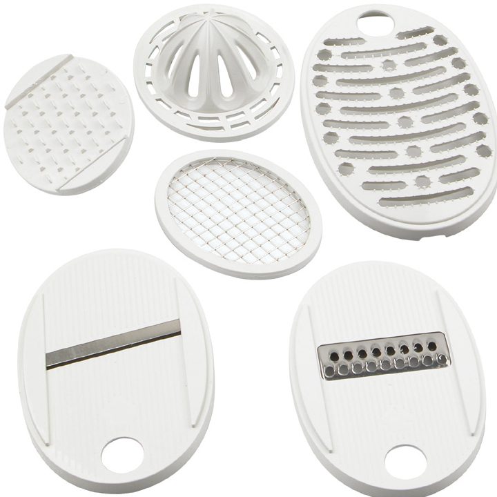 透明塑料大身,內含切片/刨絲/榨汁/壓制/過濾/碎菜配件,使用方便,安全快捷,是現代家庭廚房裡的好幫手。